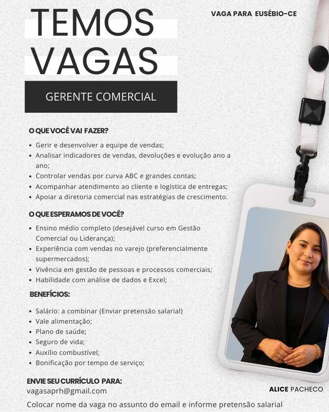 Estamos buscando um(a) Gerente Comercial para integrar nossa equipe e impulsionar nossos resultados! Local: Eusébio, CE Salário: ...
