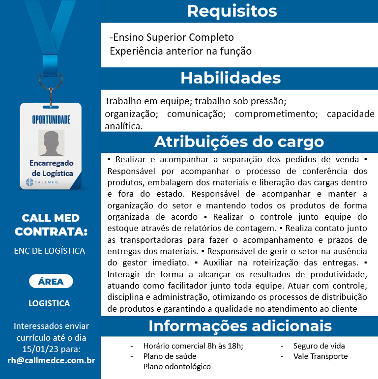 ENCARREGADO(A) DE LOGÍSTICA by Doit Vagas 2 0 comments • Compartilhe no Telegram • Compartilhe no Whatsapp Doit Vagas 2