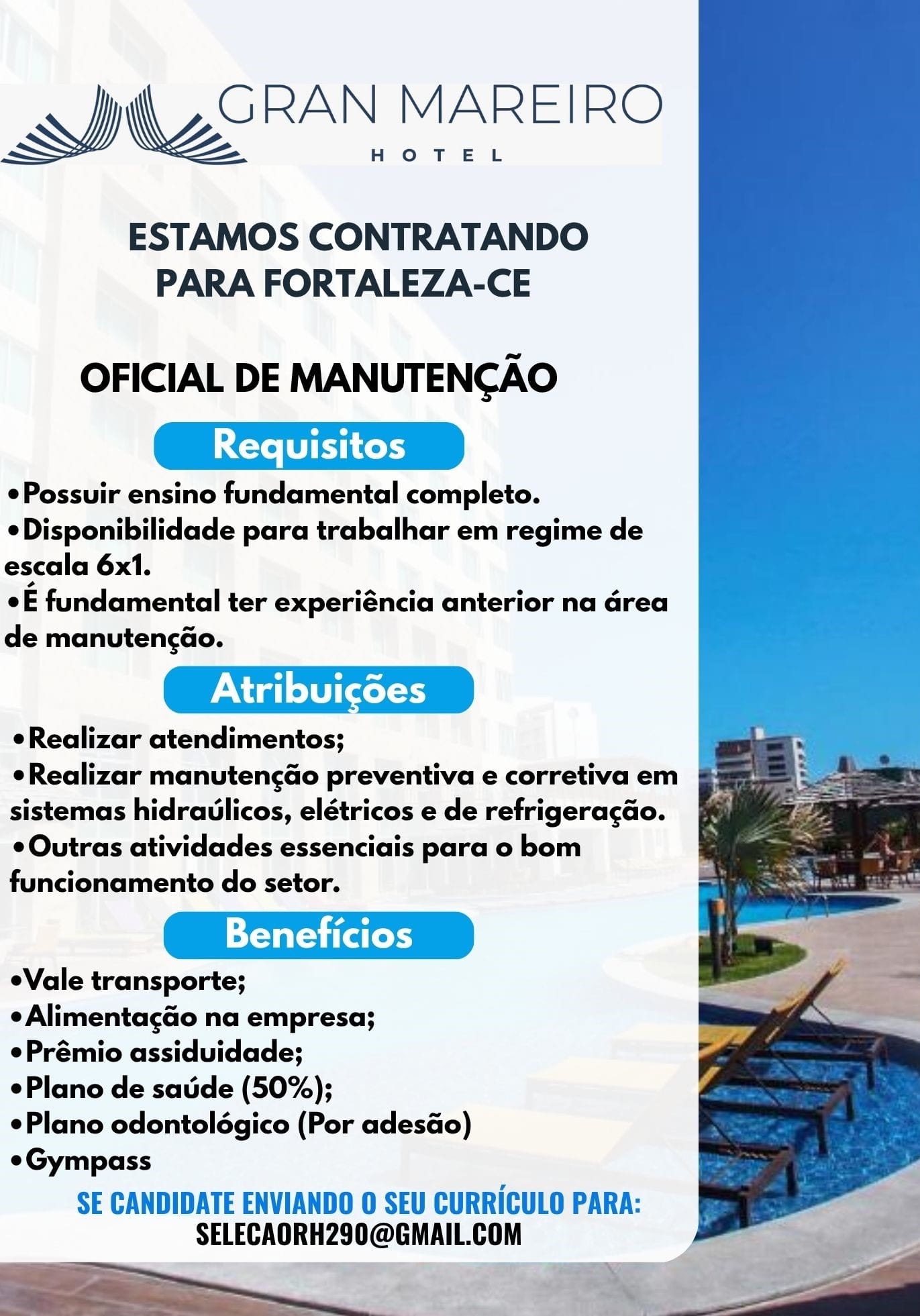 Estamos buscando um Oficial de Manutenção para se juntar à equipe do Gran Mareiro Hotel em Fortaleza! Se você possui experiência na área e busca uma oportunidade em um ambiente dinâmico, esta vaga é para você!
