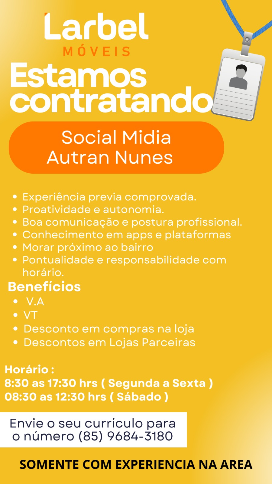 Estamos contratando um(a) profissional de Social Media para integrar a equipe da Larbel Móveis! Se você é apaixonado(a) por mídias sociais, proativo(a) e busca uma oportunidade em Autran Nunes, essa vaga é para você!